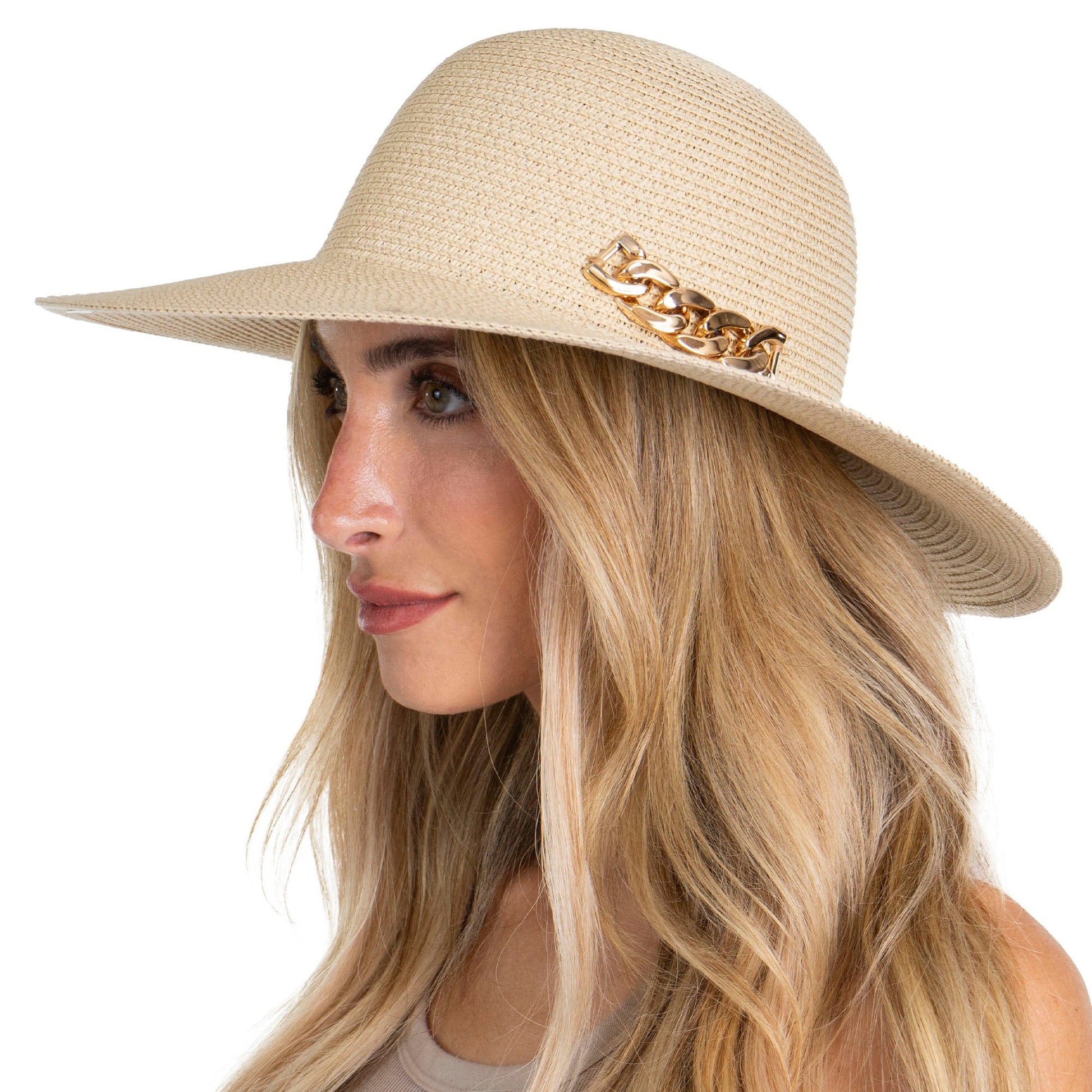 Adrienne Vittadini Women's Straw Floppy Hat with Chain Accent – UPF 50+