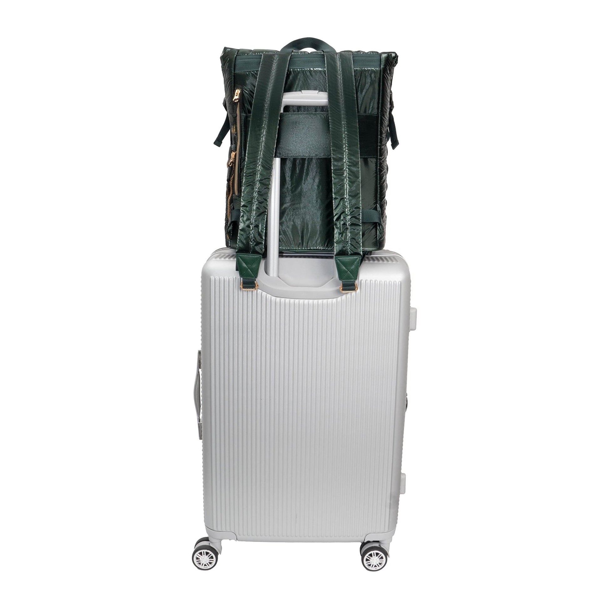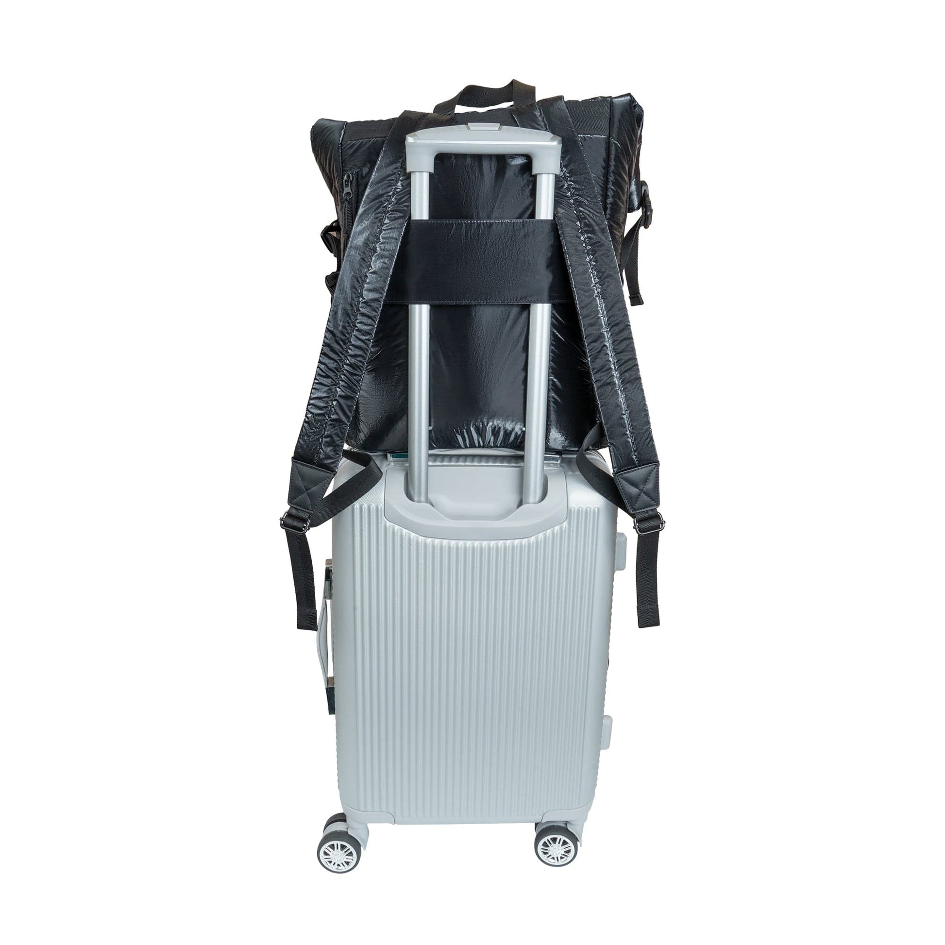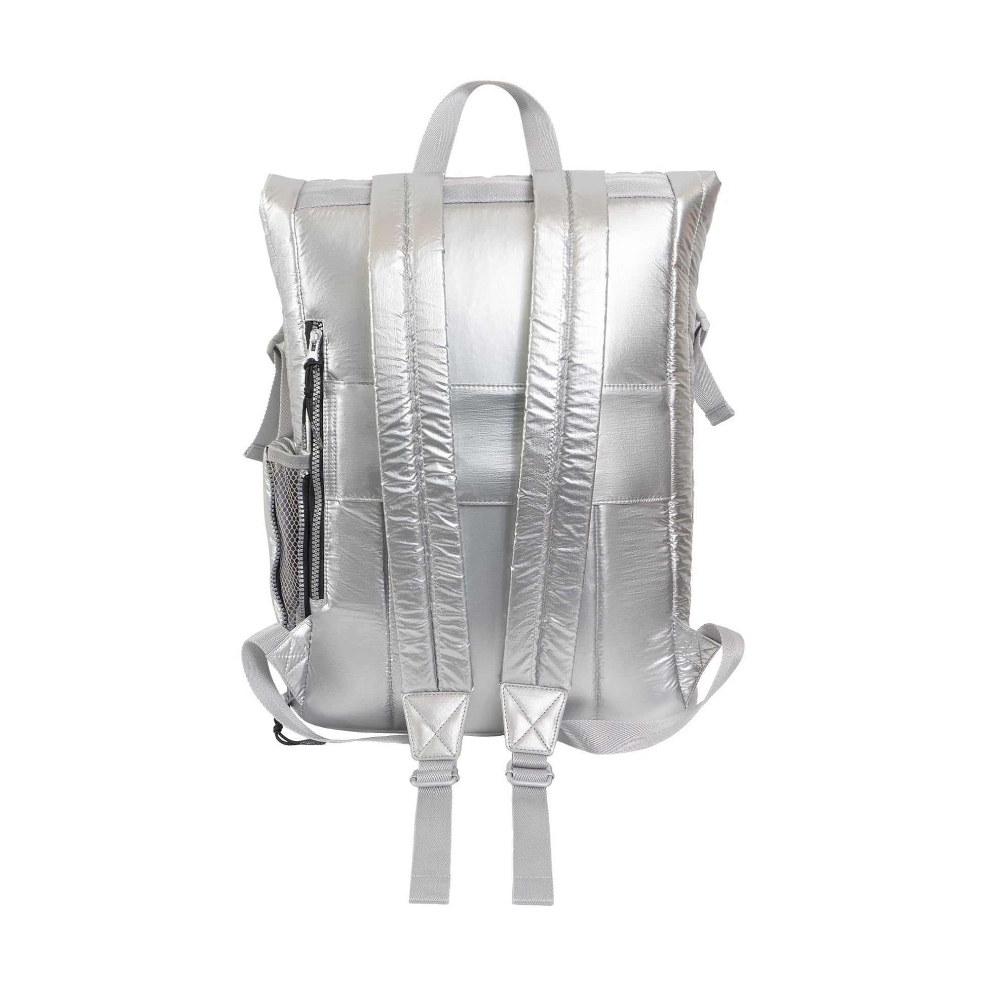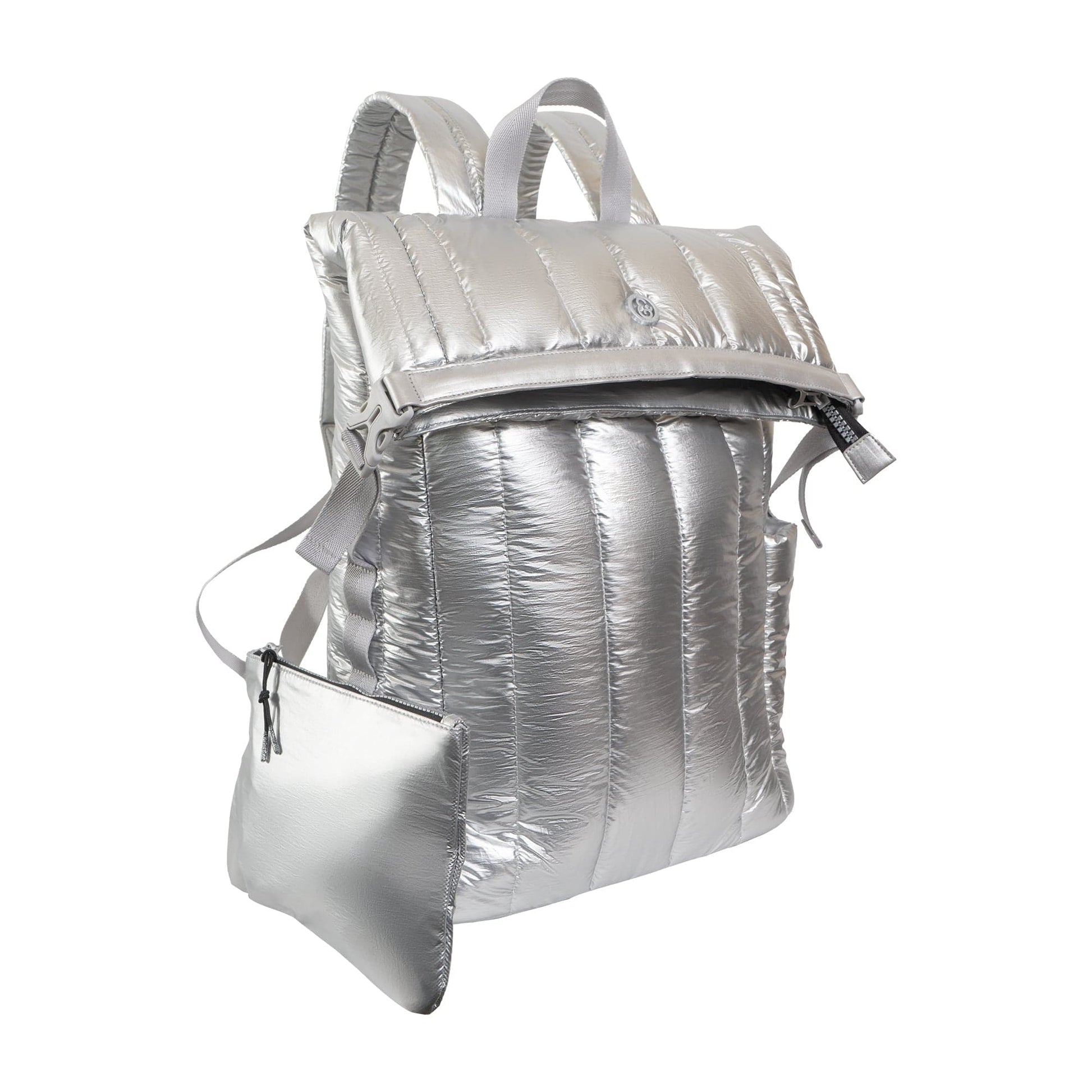 - Crafted from durable, lightweight puffer-style nylon with a sleek metallic finish.