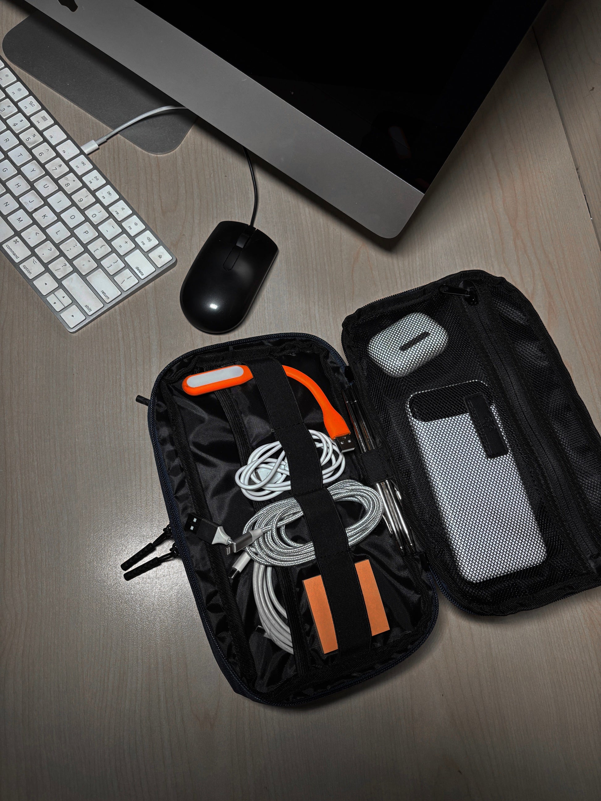 Dual Compartments: Separate storage for cables, drives, power banks, and earbuds