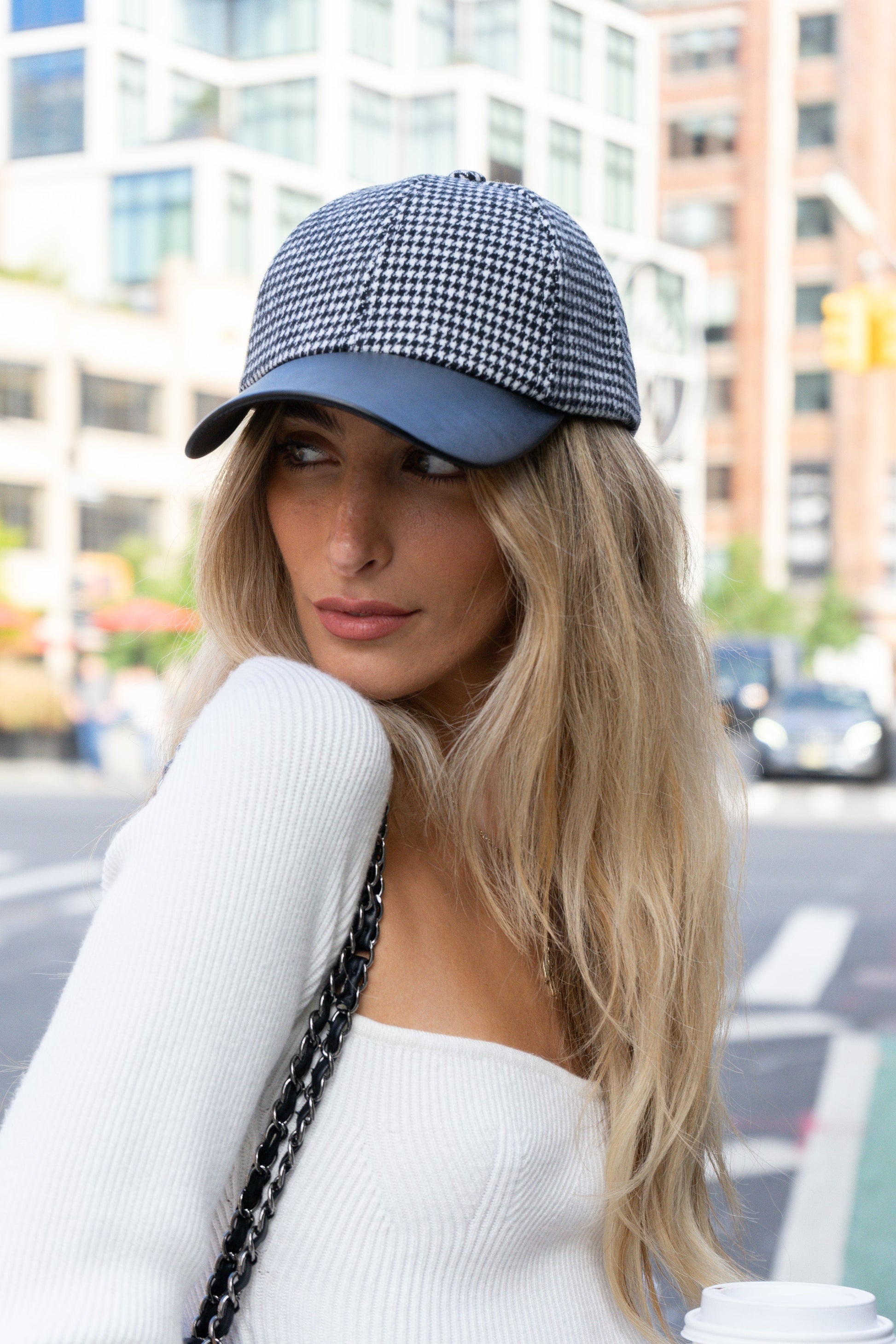 Add a touch of classic sophistication to your fall and winter outfits with the Magid Houndstooth Print Baseball Cap. Featuring a timeless houndstooth print and a sleek faux leather brim, this cap combines vintage charm with modern style for the ultimate accessory.