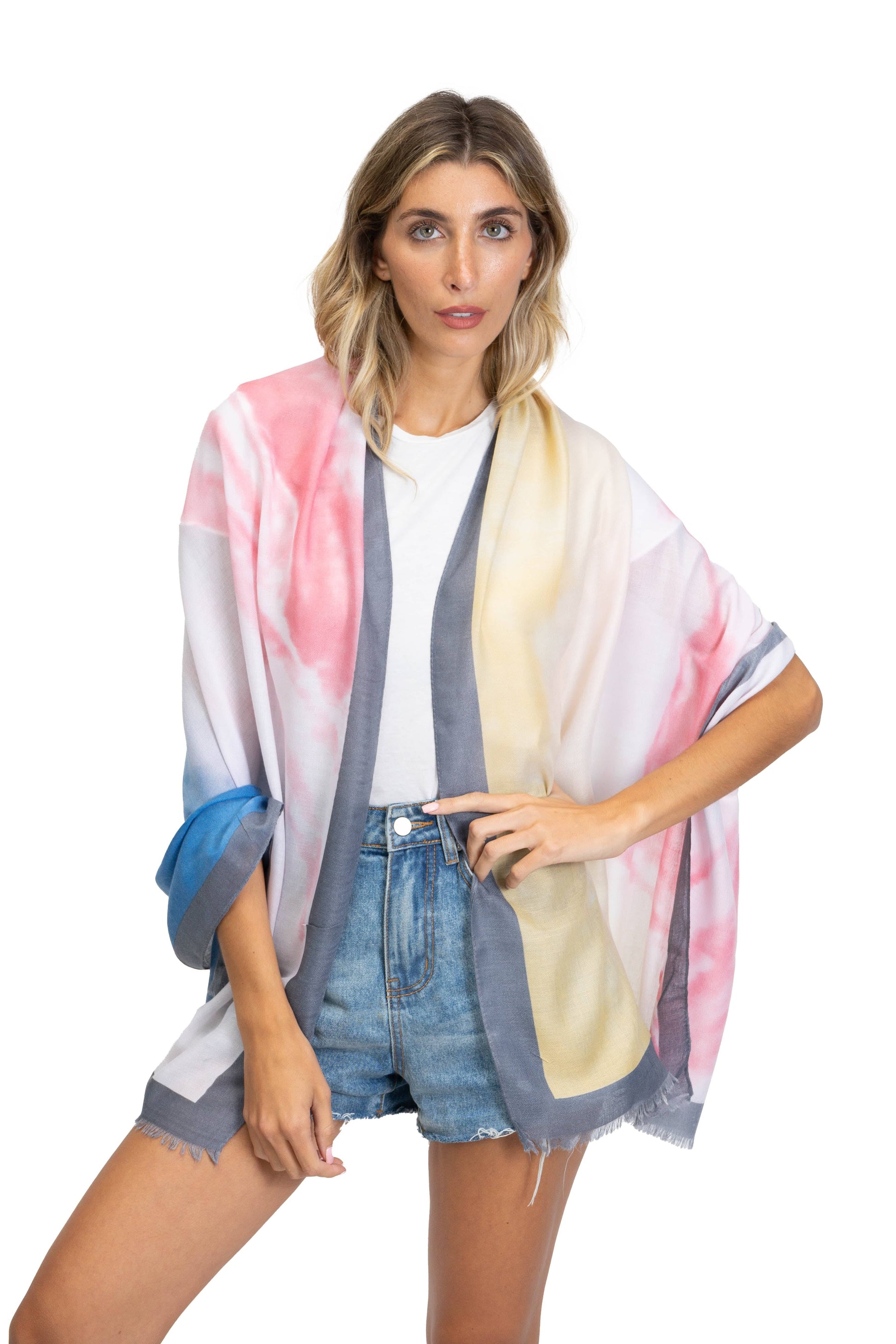 The Jessica McClintock Lightweight All-Over Tie-Dye Print Shawl is a versatile and fashionable piece that adds a splash of color and style to your wardrobe, offering endless styling possibilities.