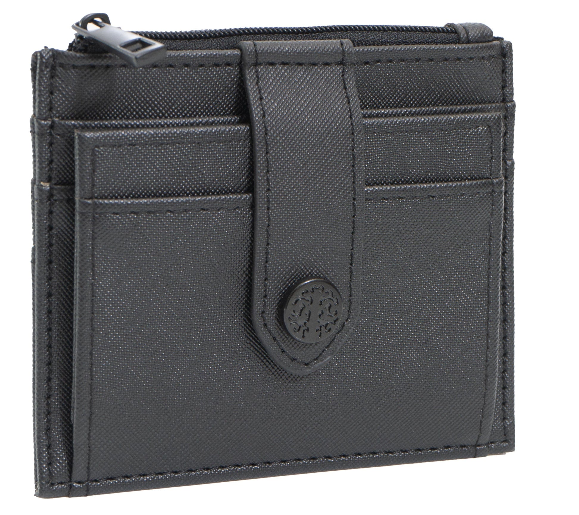 Keep your essentials neatly organized with the Rebecca & Rifka Saffiano Emblem Snap ID Card Holder. Designed with a modern compact shape and luxe saffiano-textured faux leather, this piece blends everyday utility with signature style.
