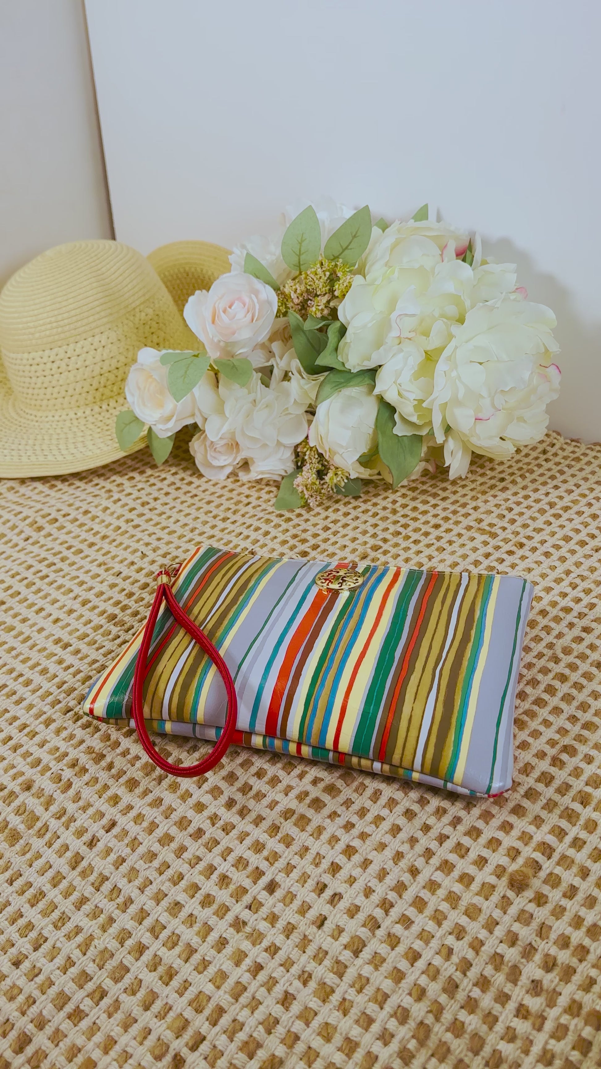 Upgrade your accessories collection with this trendy and practical Rebecca & Rifka Multi Stripe Print Medallion Zip Wristlet—a stylish companion for your everyday essentials!